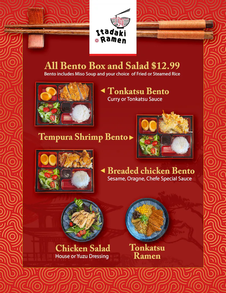Bento includes Miso Soup and your choice of Fried or Steamed Rice
